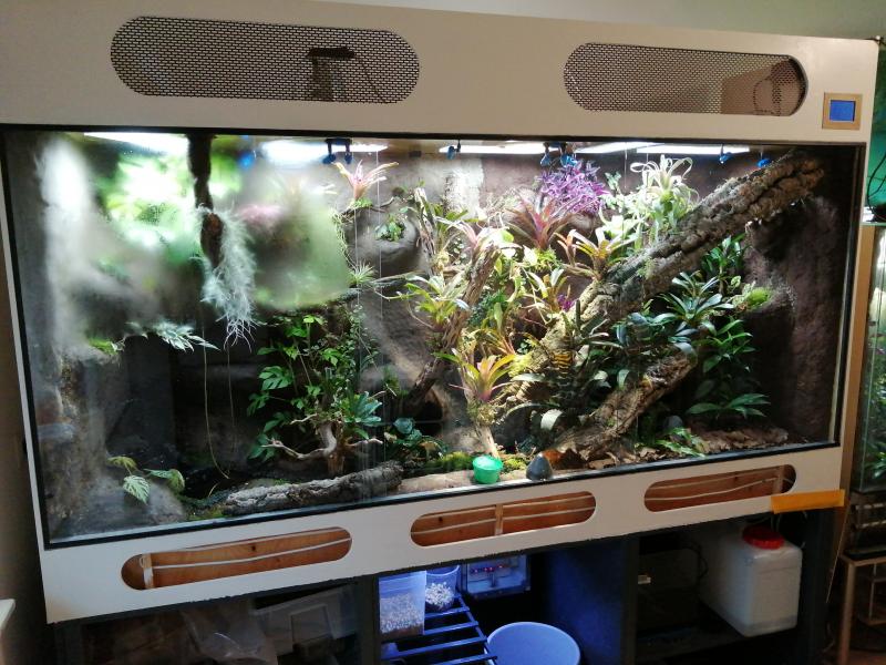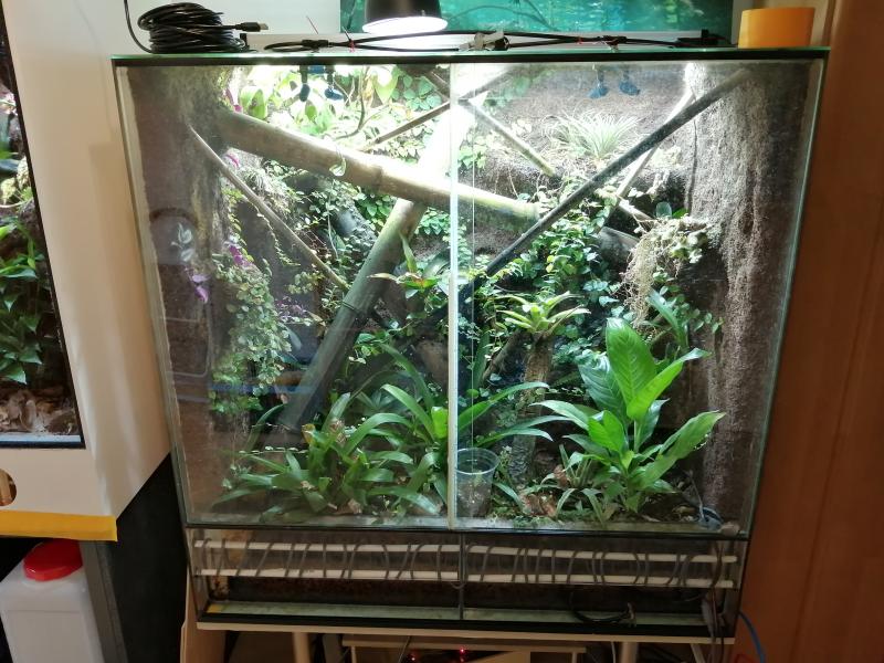 Ich habe mir nun vor ca. 1.5 Jahren ein Regenwaldterraium eingerichtet und dort insgesamt 6 Dendrobates Auratus gehalten. Diese sind nun vor 3 Tagen in Ihr neues Zuhause umgezogen, woran ich fast 6 Monate gearbeitet habe. Ich hänge euch jeweils Bilder an, wobei das alte etwas dunkel wirkt aufgrund der fehlenden zweiten Leuchte. So das nun zur Vorgeschichte