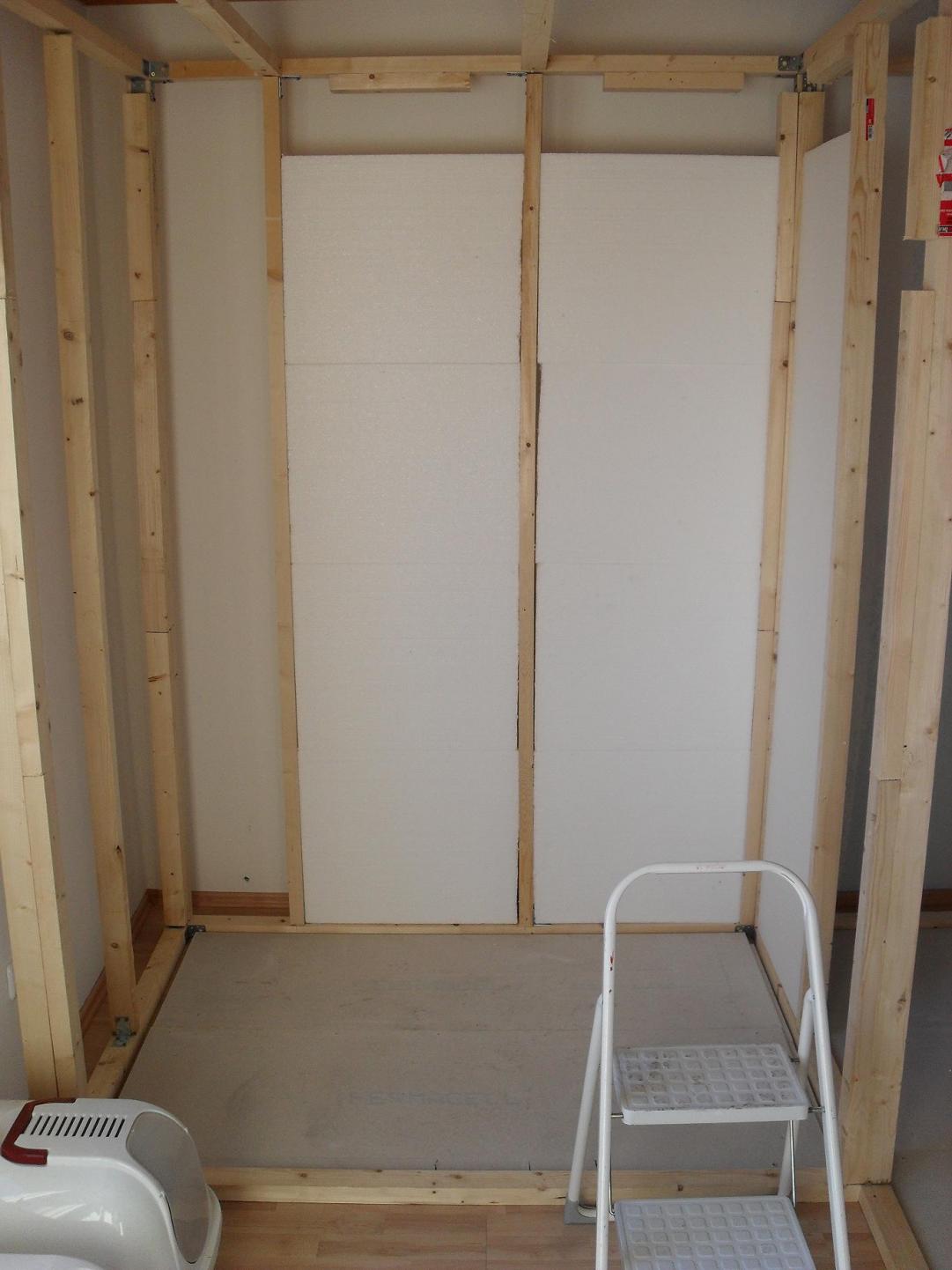 Die Grundkonstruktion wird aus 6x4 cm Holzriegeln bestehen. Auf den Laminatboden wird 20 mm starker Trockenestrich (Fermacel) schwimmend verlegt. Zwischen den Riegeln wird mit 40 mm Styropor gedämmt. Die Verkleidung, innen und außen, besteht aus 12,5 mm Rigipsfeuchtraumplatten. Diese werden verspachtelt und anschließend mit Lastogum gestrichen. Beim Iguanaterrarium wird dann verputzt und farblich gestaltet. Das Varanterrarium wird mit Korkplatten verkleidet. Der Boden wird ebenfalls mit Lastogum gestrichen und anschließend gefliest. Die Türen werden aus Kunststofffenstern sein.