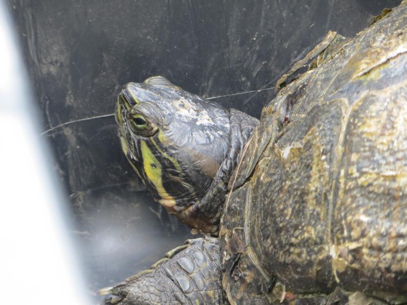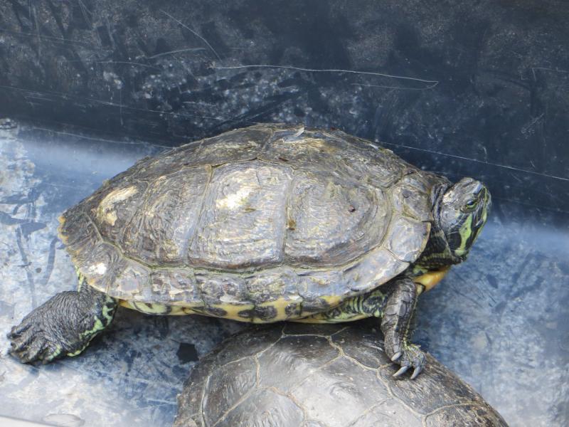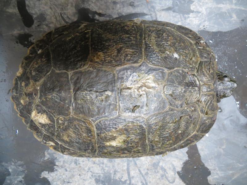 diese Schildkröte hat leider nekrotische Stellen am Panzer und eine Bissverletzung am Kopf. Die Verletzung kommt mit hoher Wahrscheinlichkeit von dem Männchen, mit dem sie die letzte Jahre gemeinsam in einem Teich leben musste (siehe anderer Post). Beides wird inzwischen behandelt.