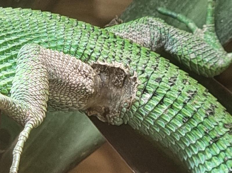 Ich kenne ein ähnliches Bild bei Gonocephalus. Da war die Ursache eine schwer zu bekämpfende Pilzinfektion und die waren generell anfällig dagegen. Evtl sollte ein Vet mal einen Abstrich machen.