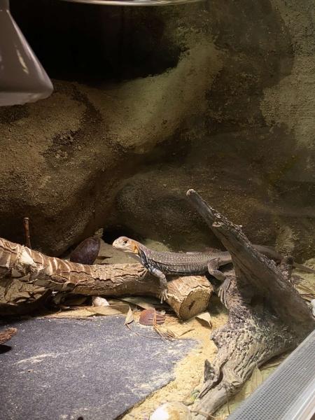 Terrarium ist 150x60x100cm, 130kg Bodengrund. Wärmespot 55C Grundtemp 25-30C.