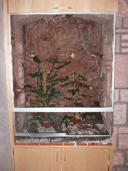 ich wollte mir zwei Jemenchamäleons holen weil mich die Tiere total faszinieren! Aber nachdem ich mir zwei drei Bücher zugelegt habe musste ich feststellen das man sie nicht in einen Terrarium als Paar halten kann! Aber in einen großen Terrarium gänge dies, steht drin! Was ist groß??? Mein Terrarium ist 1,20m x 1m x 1,70m (BxTxH) groß (siehe bild im anhang). Wie siehts da bei Chamaelo jacksonii aus? oder welche Chamäleon art kann man als Paar halten? Das Terrarium ist noch ne fertig eingerichtet auf dem Foto. Es kommen noch paar Korkenzieheräste rein und noch zwei Hängepflanzen. Könnte mir da vielleicht noch jemand paar Tipps geben was da noch reinpassen könnte? Müssen eigentlich Tropftränken rein wenn man sie mit der Pipette tränkt und außerdem noch ne Regenanlage drin ist???
