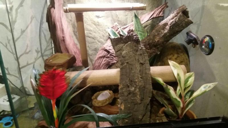 Habe zur Zeit noch zwei Hölzer an der Rückwand und eine Plattform aus Bambus gebaut, Bodenhöhle und Baumhöhle werden leider nicht genutzt.