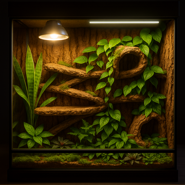 - Ich würde eine Solar Raptor oder Bright Sun in 50 W von außen über einem Gazedeckel im linken Drittel aufhängen. Ich möchte die Lampe auch so anbringen, dass es durch die Zwischenebenen mehrere Sonnenplätze mit unterschiedlichen Temperaturen gibt. Außerdem gäbe es dann nach rechts hin ein Temperaturgefälle. Oder würde es dann zu kalt werden auf der rechten Seite? Meine Wohnung ist generell immer recht warm mit durchschnittlich 22 °C.