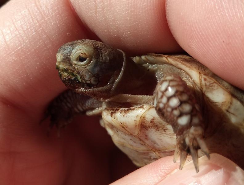 Ich war mit der Kleinen auch schon beim Tierarzt. Zu dieser Zeit war das Auge verklebt. Er hat mir Augentropfen gegeben und gesagt, ich soll das Auge mit Käsepappeltee auswaschen, sodass sich der Belag löst. Das hat auch gut funktioniert. Aber ganz gut ist es nicht geworden. Nach der Winterstarre war das Auge wieder zu. Das ist aber mit regelmäßigen Baden im Wasser schnell weg gegangen.