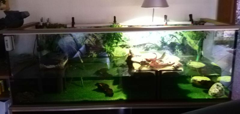 Das Aquarium dürfte so 150x40 cm sein. Der Wasserstand so 15 cm schätze ich. Oberhalb des Wassers ein Landteil ca. 25x40 cm mit einer Wärmelampe. Das Wasser ist beheizt.