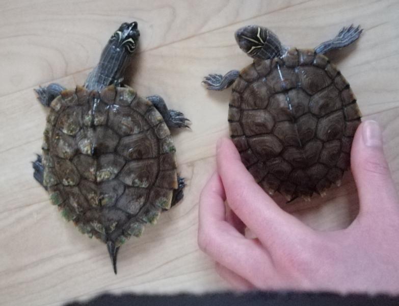Eigentlich sollten sie jetzt getrennt werden, aus den oben genannten Gründen. Weibchen sind fast dreimal so groß wie erwachsene Männchen und haben eine kürzere Schwanzbasis, die Kloake ist näher am Bauchpanzer und der Schwanz ist etwas schlanker. Dazu haben sie kürzere Krallen an den Vorderpfoten als die Männchen.