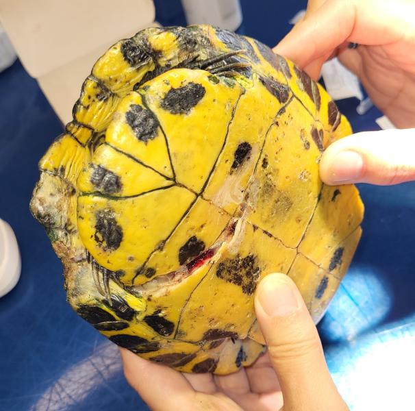 Gestern wurde ich von einer Station kontaktiert, dass Patienten eine verletzte Schildkröte gefunden haben.
