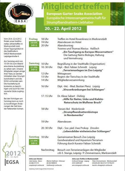 Am 20.-22.4.2012 findet die Jahrestagung der Strumpfbandnatternvereinigung (EGSA) in Markranstädt statt. Weitere Infos unter www.egsa.de