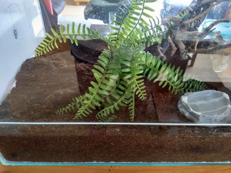 Im Terrarium ist eine Wasserschale, eine Wurzel und eine künstliche Pflanze.